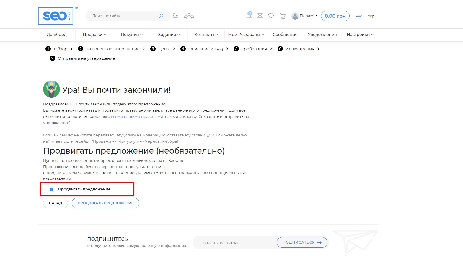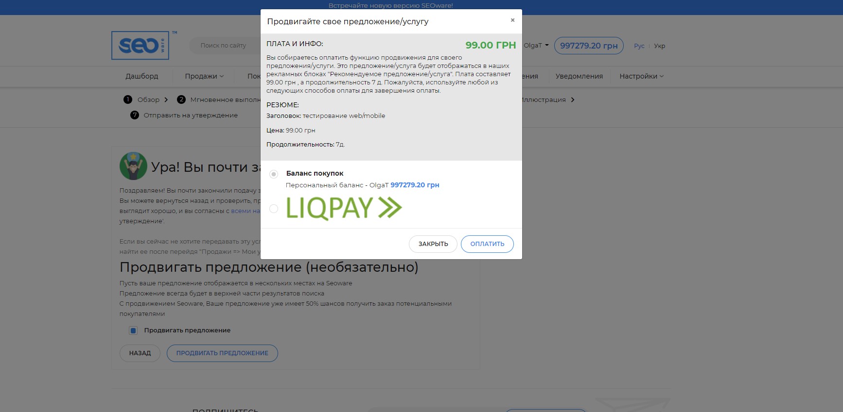 В открывшемся окне выберите способ оплаты и подтвердите действие, при корректной оплате Вы получите уведомление о продвижении Вашего предложения на сайте.