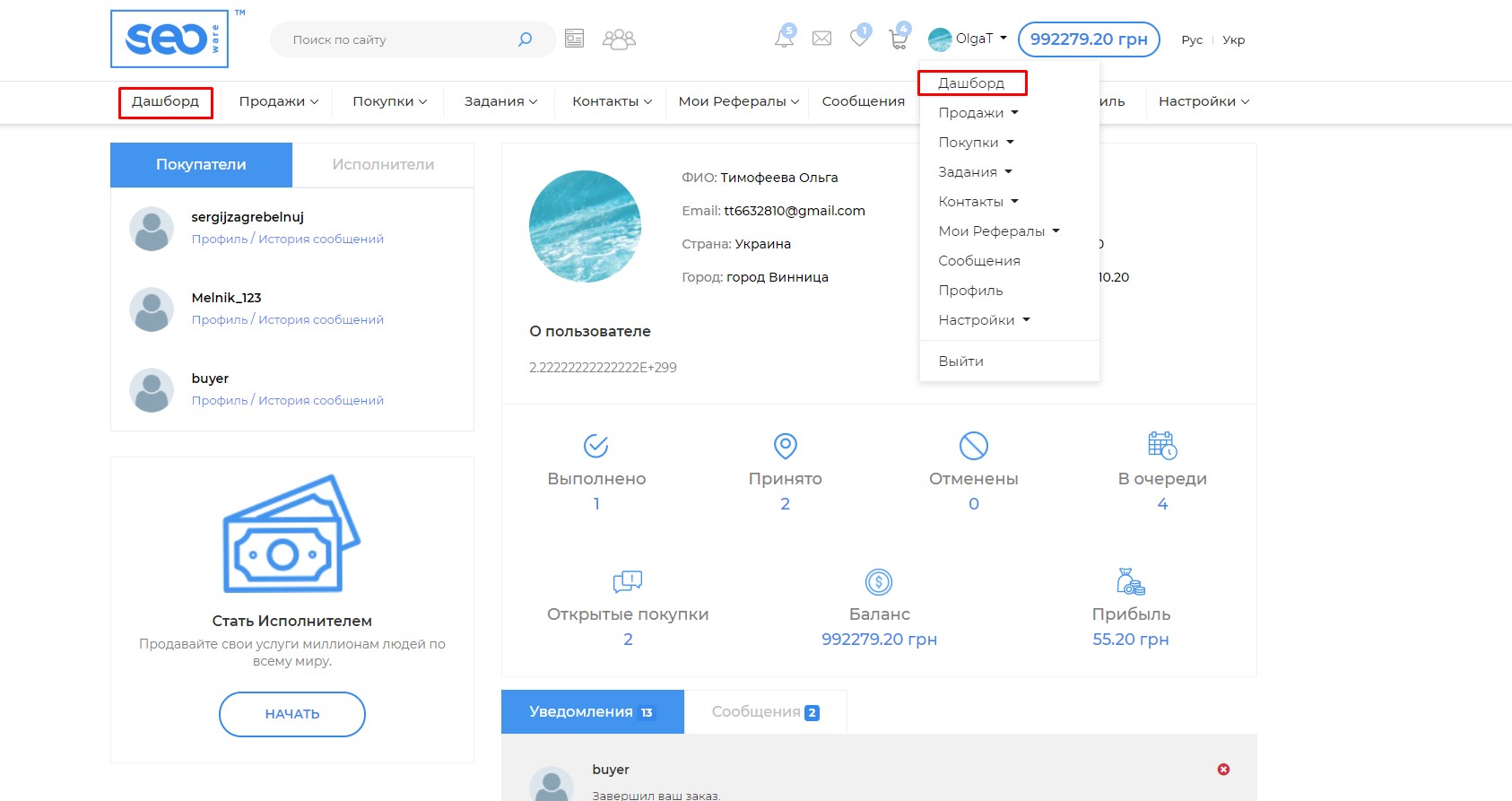 - вкладка Исполнители - нажмите на вкладку и ознакомтесь со списком исполнителей, по клику на Профиль/История сообщений можна ознакомиться с профилем и пересмотреть переписку соответственно по данному исполнителю