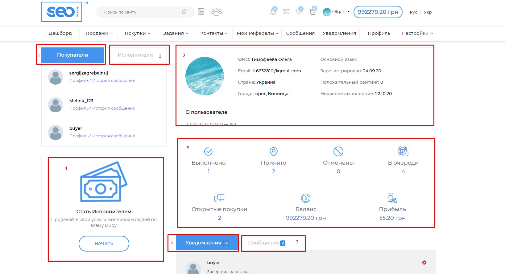 - вкладка Покупатели - нажмите на вкладку и ознакомтесь со списком покупателей, по клику на Профиль/История сообщений можна ознакомиться с профилем и пересмотреть переписку соответственно по данному покупателю