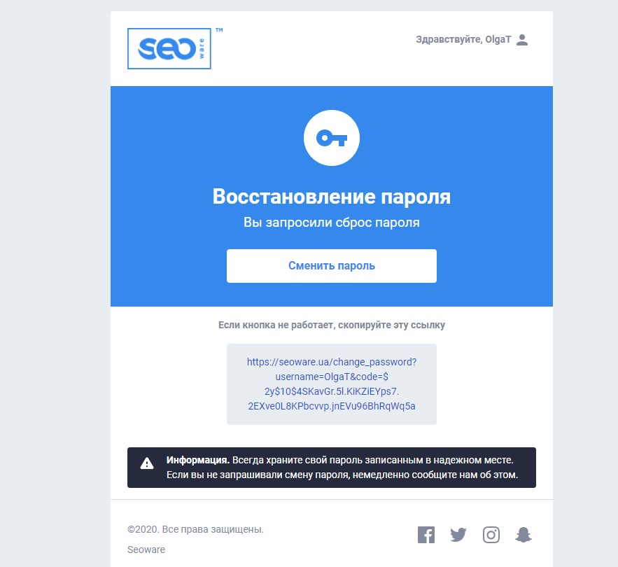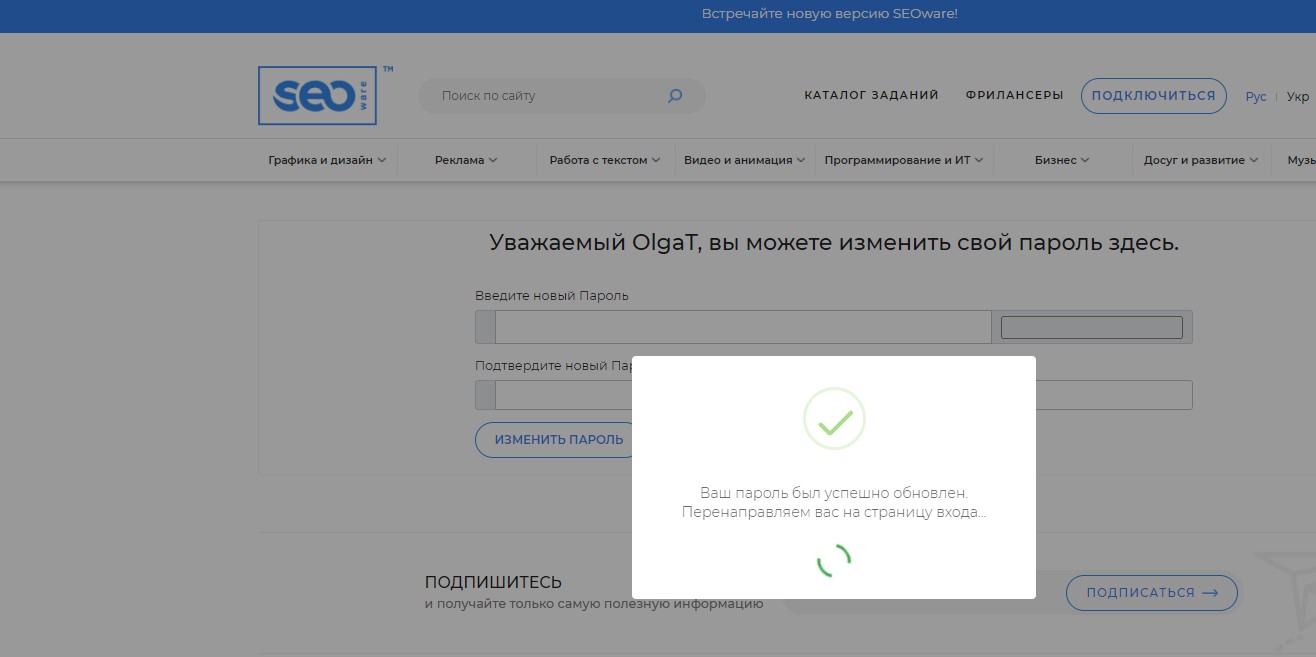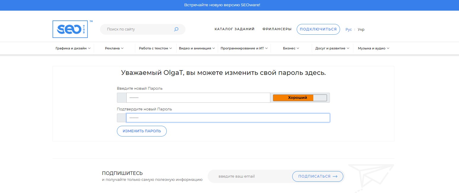 Нажмите кнопку "Сменить пароль" или ссылку, введите новый пароль, в строке ввода пароля появится информация о его надежности, далее повторите пароль и сохраните. После успешного изменения пароля Вы перенаправитесь на страницу входа, где нужно ввести новый пароль, чтобы войти в свою запись.