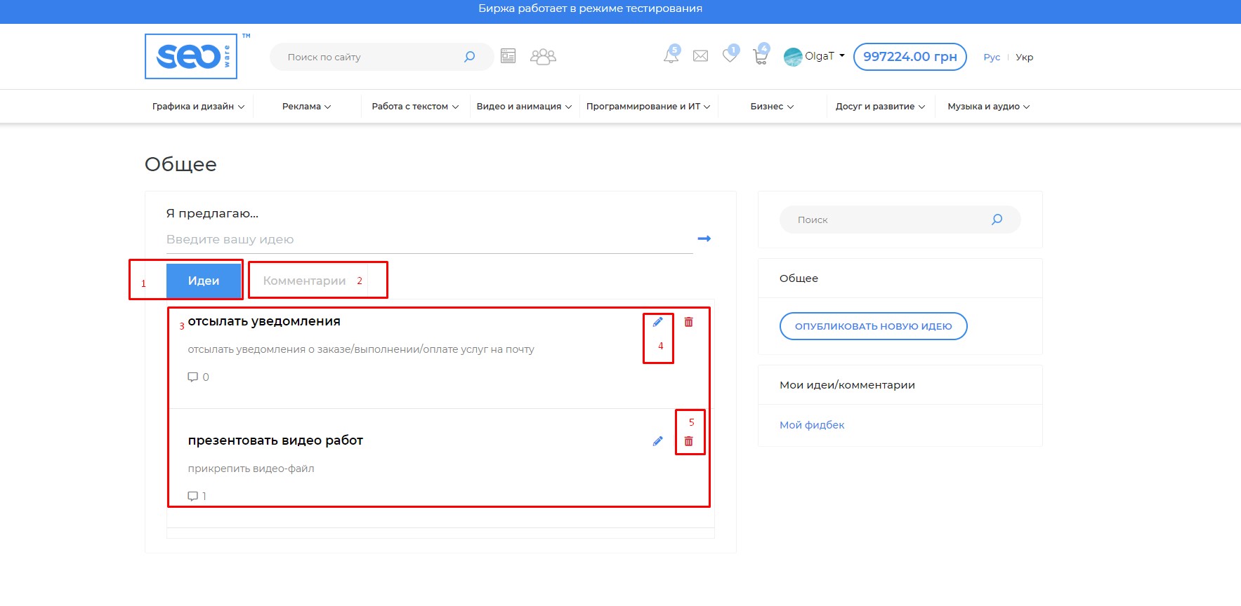 - кнопка "Опубликовать новую идею" - для создания новой идеи