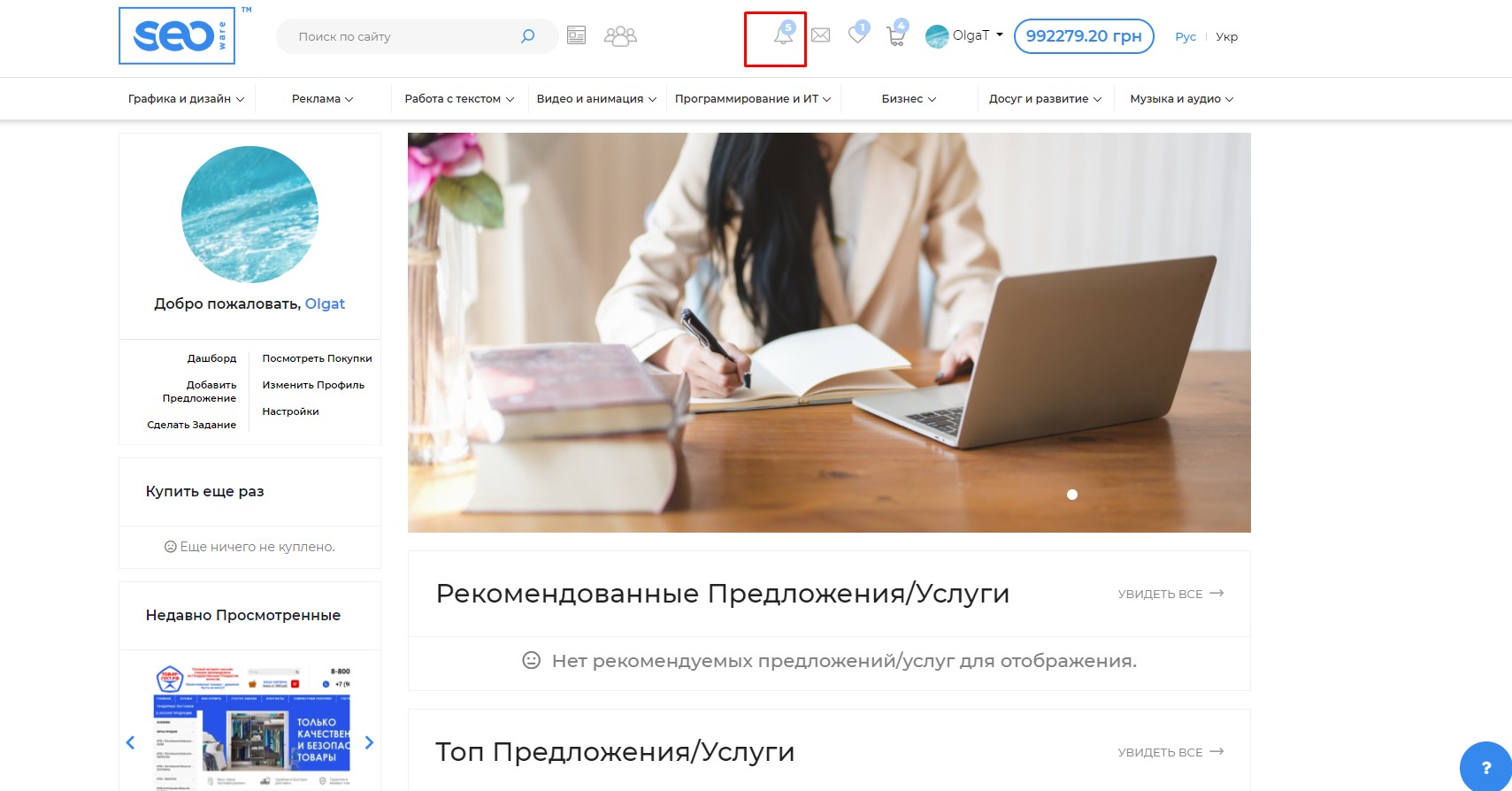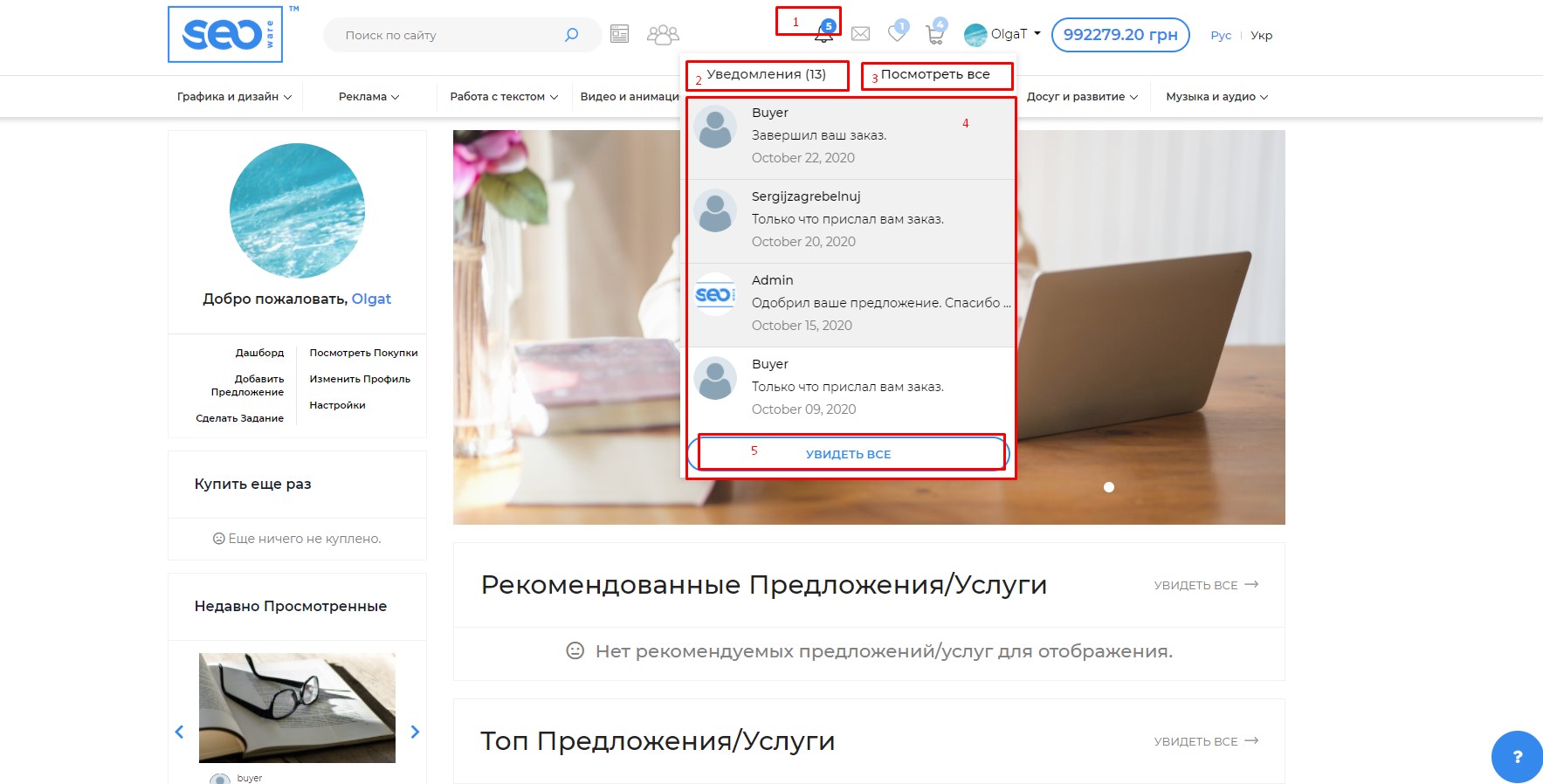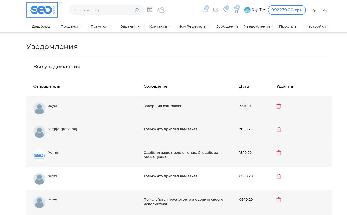 Все пользователи системы имеют доступ к Уведомлениям. Используя уведомления легко контролировать заказы и их выполнение, одобрение администраторами Ваших предложений. Для работы в данном разделе нажмите на иконку "Уведомления" в верхней панели, функционально доступно:
