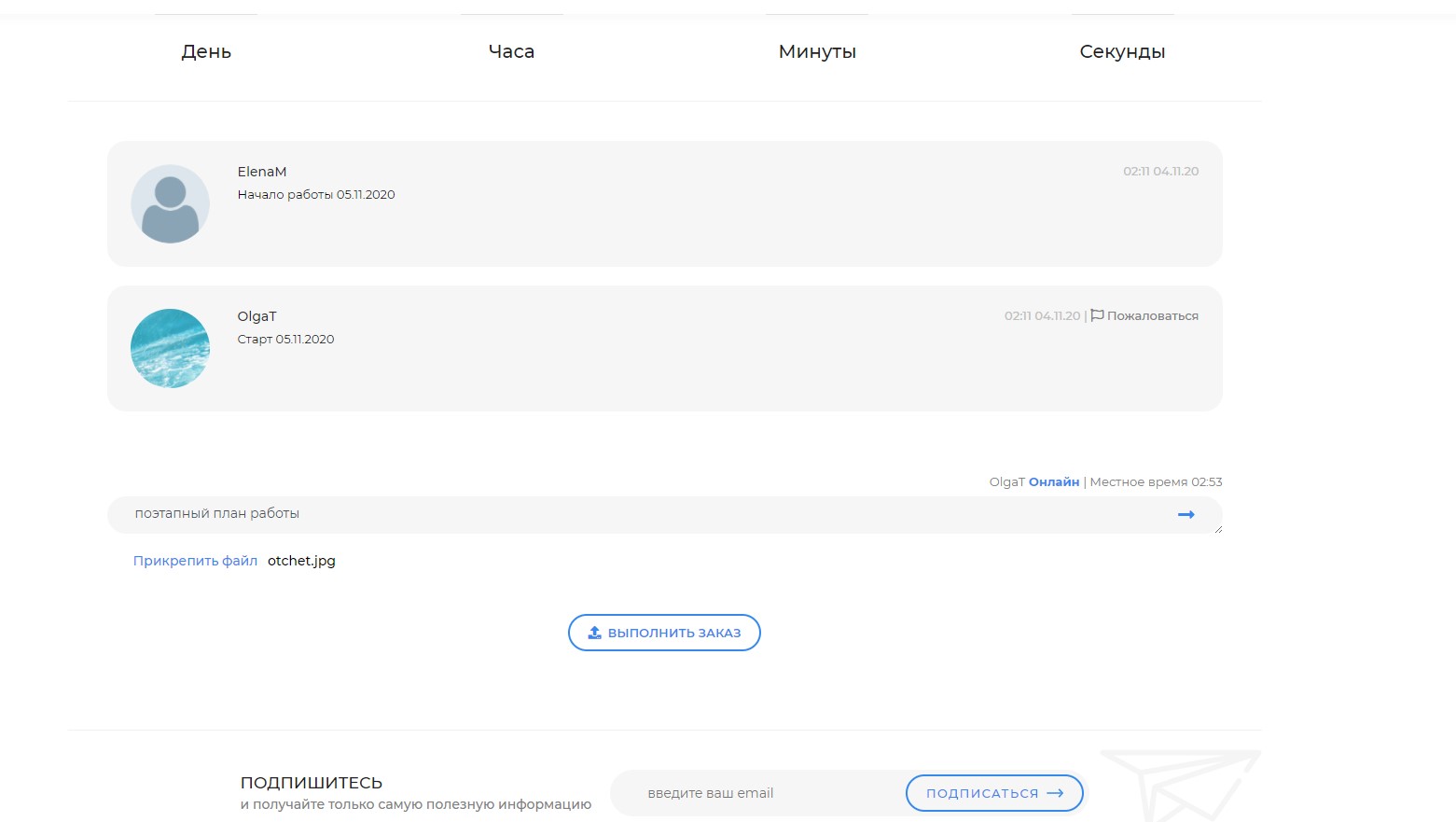 - выполненный заказ прикреплен в формате сообщения и файла