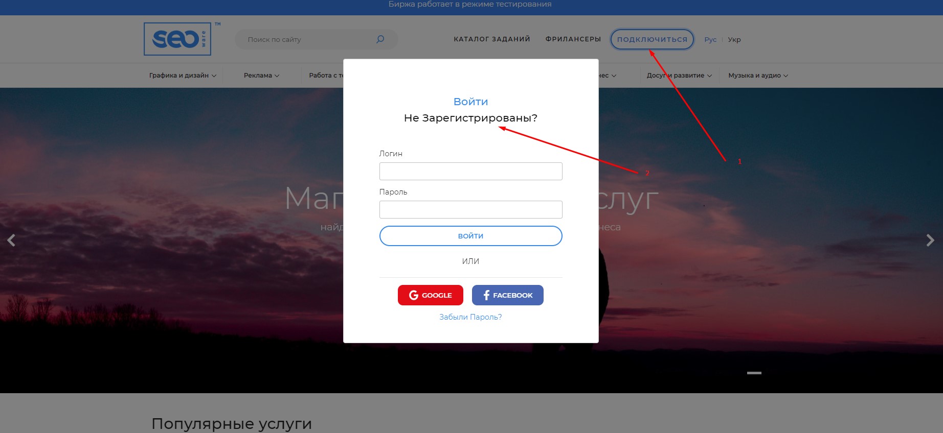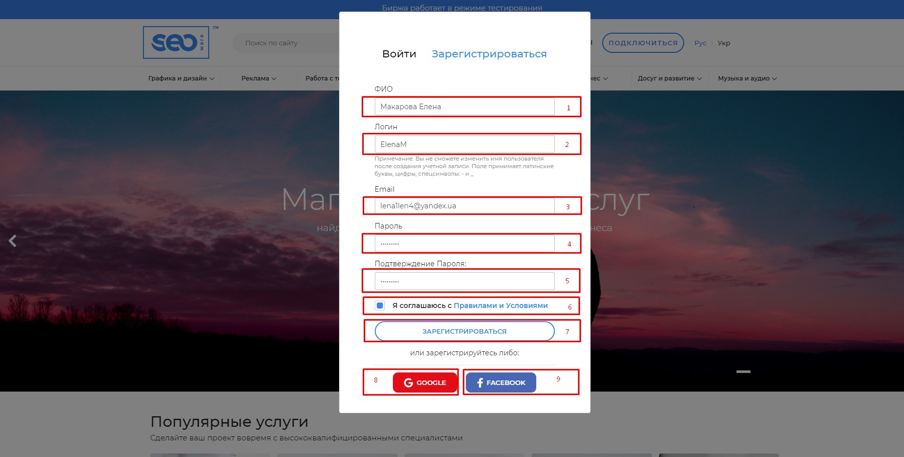 - кнопка "Facebook" - для регистрации с помощью Facebook