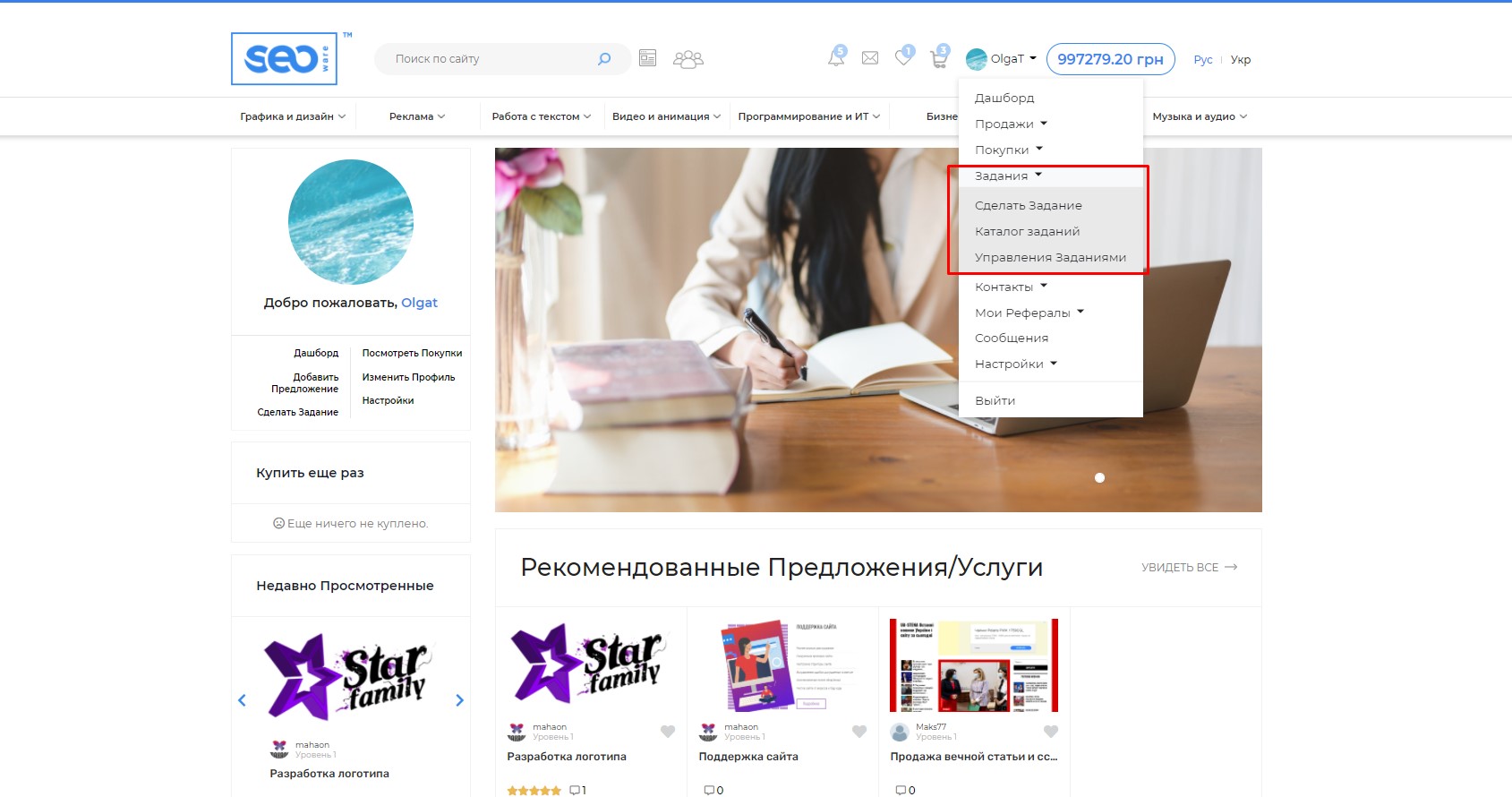 Для зарегистрированного пользователя в разделе "Задания" доступны: