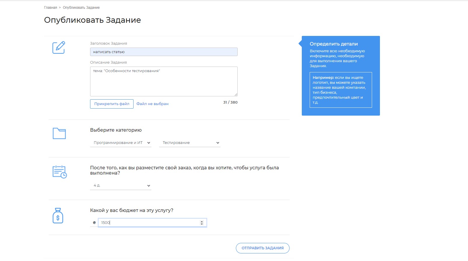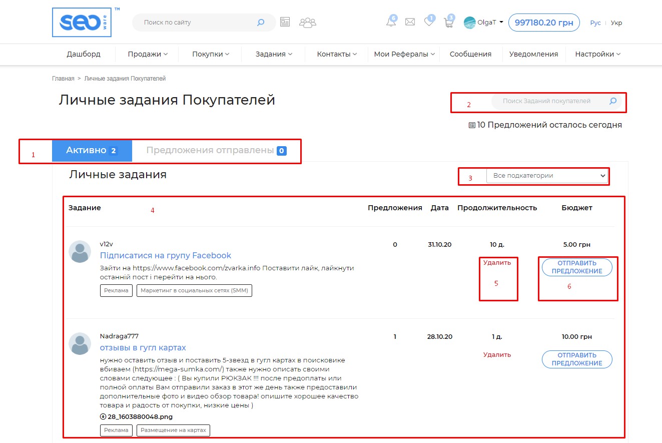 - кнопка "Отправить предложение" - по нажатию на которую данное задание будет отображено во вкладке "Предложения отправлены"