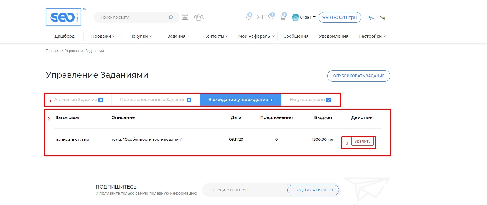 - вкладки: Активные задания, Приостановленные задания, В ожидании утверждения, Не утверждено