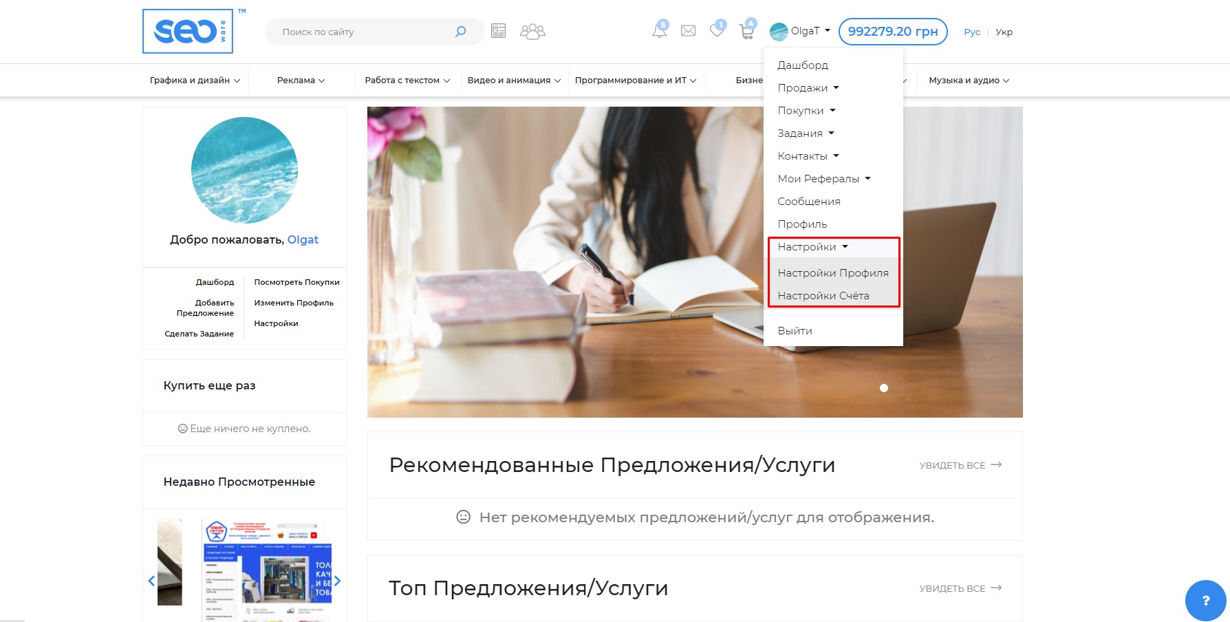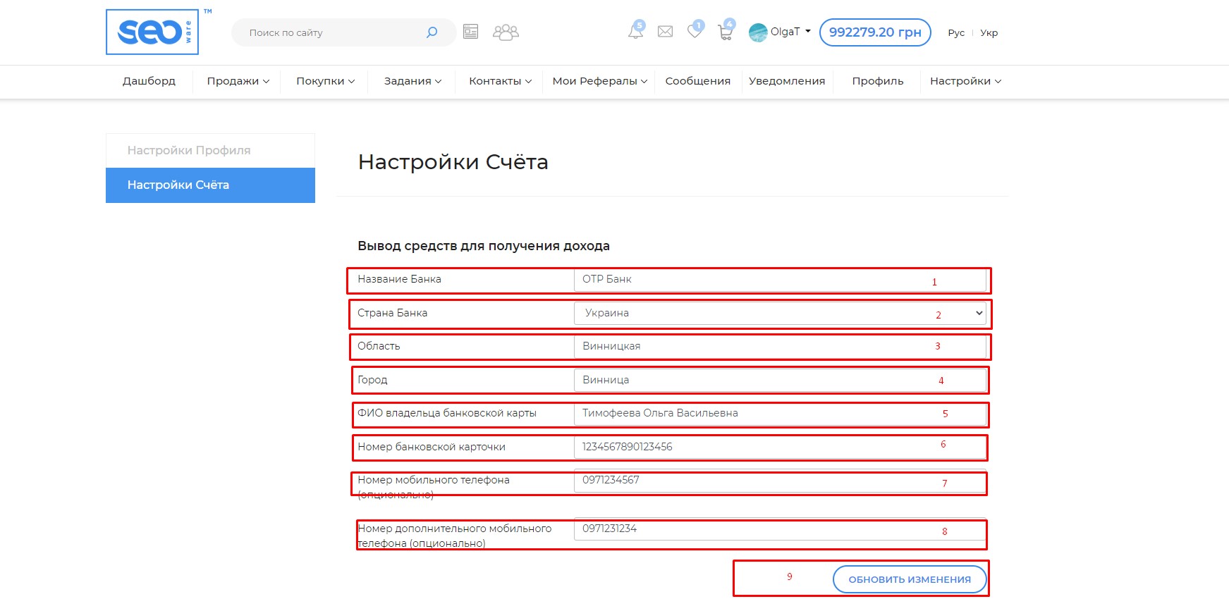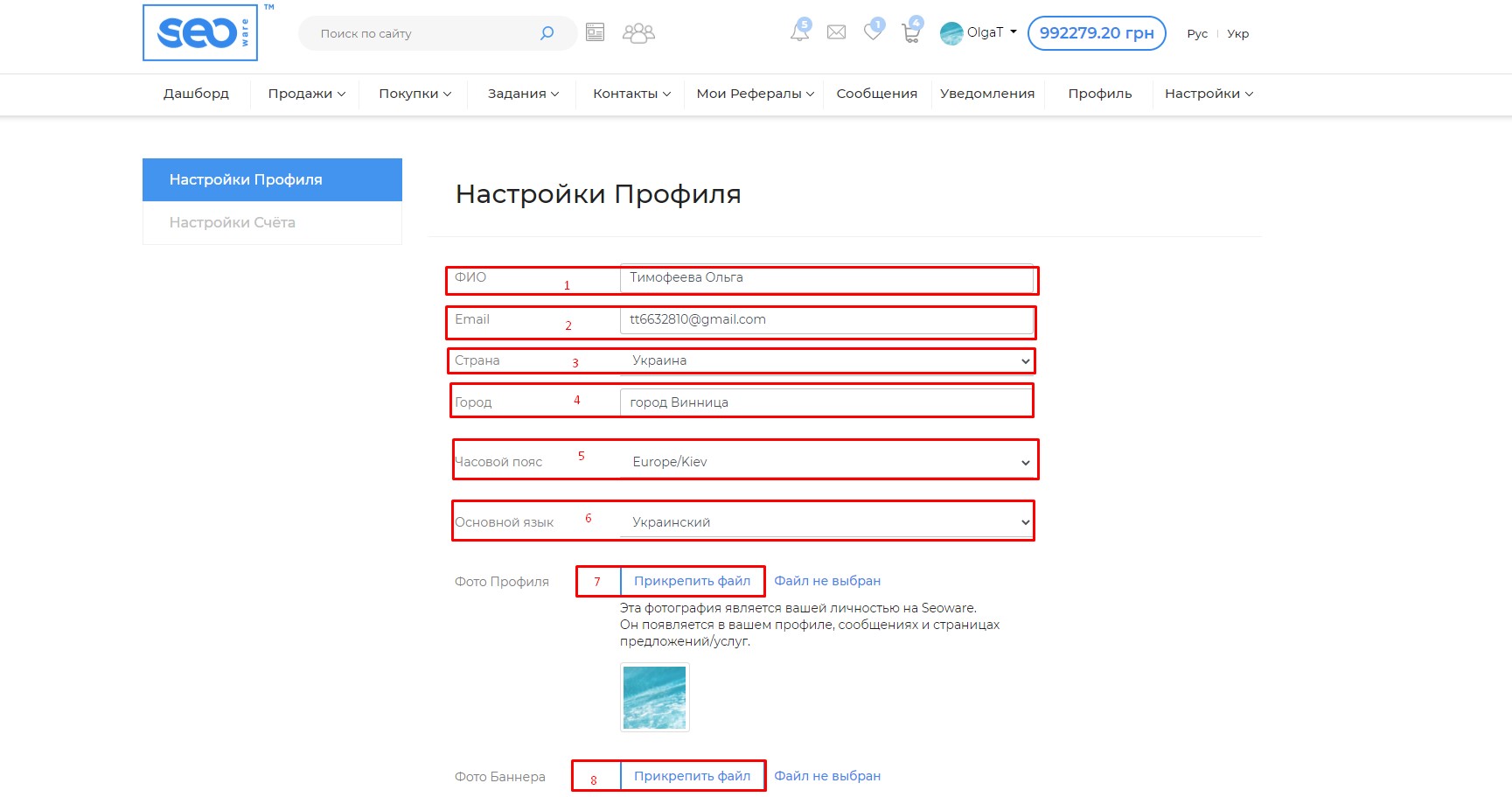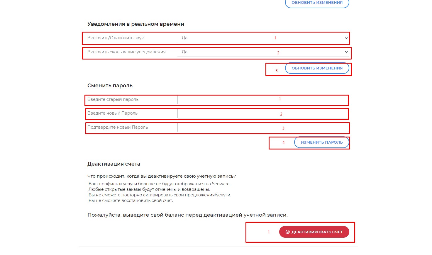 В блоке "Деактивация счета" при нажатии кнопки "Деактивировать счет" отображение Ваших предложений и услуг на Seoware будет приостановлено, любые открытые заказы будут отменены и возвращены, не будет возможности повторно активировать свои услуги и предложения и восстановить счет.